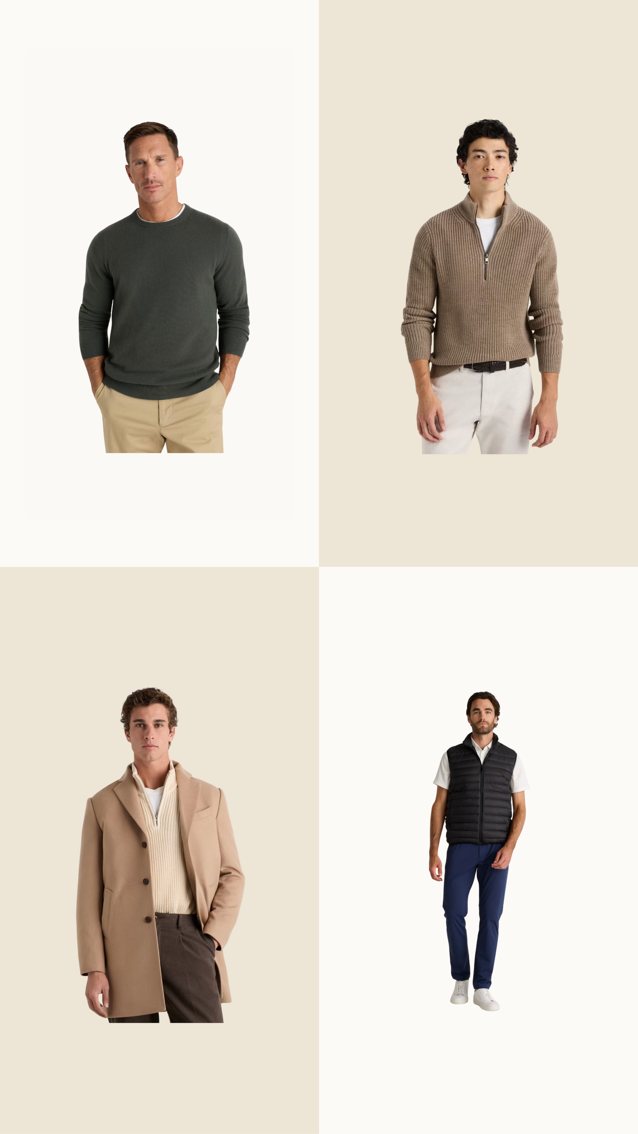 cashmere crewneck sweater // merino wool half zip sweater // cashmere overcoat // protech golf pants